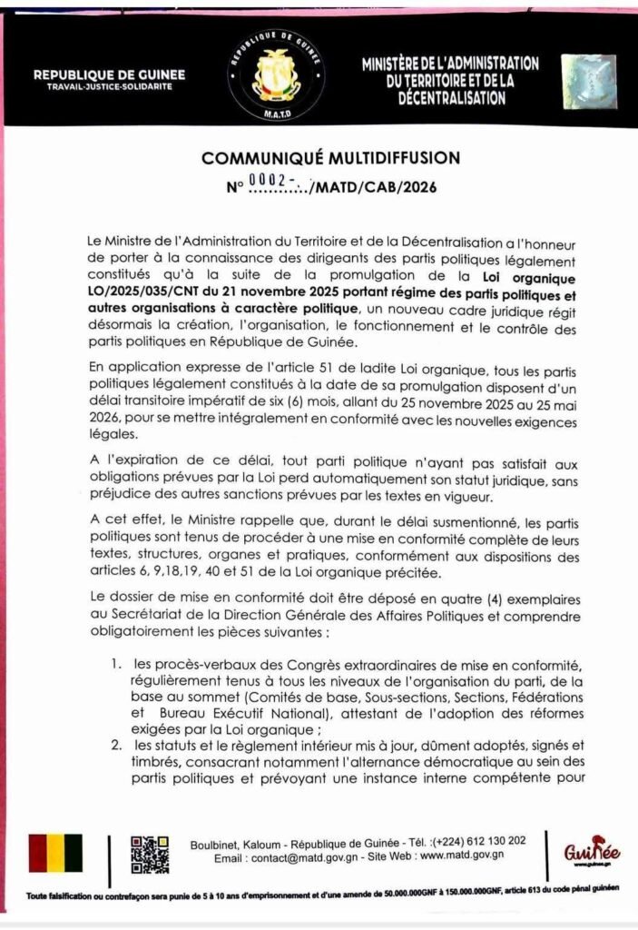 Conakry — Dans un communiqué officiel daté du 25 février 2026, le Ministère de l’Administration du Territoire et de la Décentralisation (MATD) a rappelé aux partis politiques légalement constitués les nouvelles obligations issues de la Loi organique L/2025/035/CNT du 21 novembre 2025 portant régime des partis politiques et autres organisations à caractère politique.