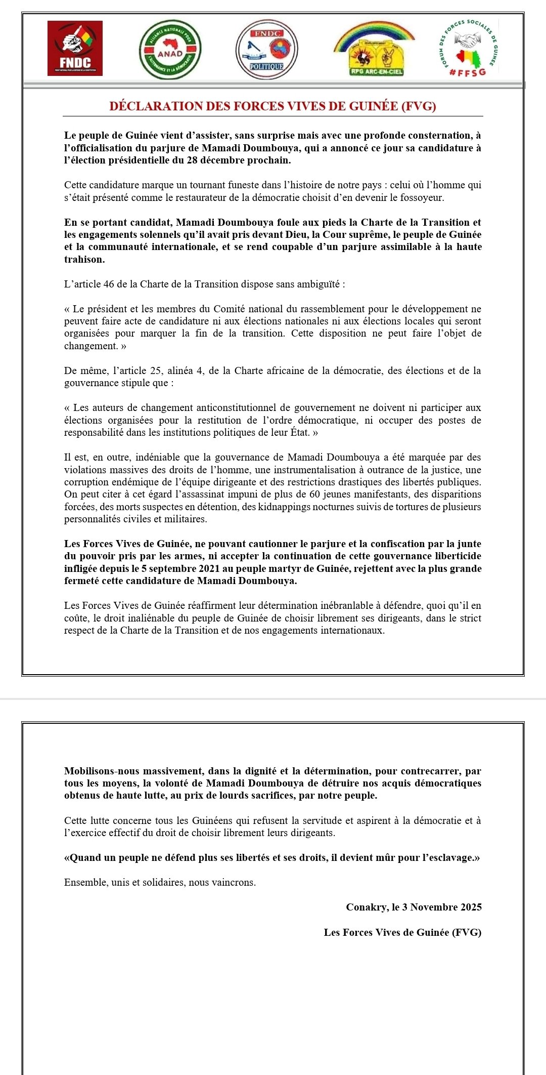 Les Forces Vives de Guinée réaffirment leur détermination inébranlable à défendre, quoi qu’il en coûte, le droit inaliénable du peuple de Guinée de choisir librement ses dirigeants, dans le strict respect de la Charte de la Transition et de nos engagements internationaux.